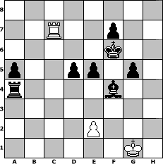 game notation in PGN-format [Event "Fr"] [Site "www.myChess.de"] [Date "2016.01.30"] [Round "1"] [White "wolni55"] [Black "Gauss1233"] [ECO "B01"] [WhitemyELO "1488"] [BlackmyELO "1415"] [Result "0-1"] [TimeControl "10/2592000"] [WhiteDays "111"] [BlackDays "120"] [MyChessNo "102275"] 1. e4 d5 2. e5 e6 3. d4 a6 4. a3 c5 5. Nf3 Nc6 6. c3 cxd4 7. cxd4 b5 8. Bd3 b4 9. a4 a5 10. Qc2 Qb6 11. Bxh7 Nge7 12. Be3 b3 13. Qd1 Rxh7 14. O-O Nf5 15. Nbd2 Ncxd4 16. Nxb3 Nxf3+ 17. gxf3 Nxe3 18. fxe3 Qxe3+ 19. Kh1 Qxe5 20. Rf2 Bd6 21. f4 Qe4+ 22. Qf3 Qxf3+ 23. Rxf3 Rh4 24. Raf1 Ba6 25. Rg1 g6 26. Nd2 Bxf4 27. Nf1 Bxf1 28. Rgxf1 g5 29. Rd1 Rxh2+ 30. Kg1 Rxb2 31. Rh3 Ke7 32. Rdd3 Rc8 33. Rc3 Rxc3 34. Rxc3 Rb4 35. Ra3 e5 36. Rc3 Rxa4 37. Rc7+ Kf6 0-1 position notation in FEN-format 8/2R2p2/5k2/p2pp1p1/r4b2/8/4P3/6K1 - - - 2 38 Captured white pieces: Captured black pieces: Click on a captured piece in order to display the desired move!