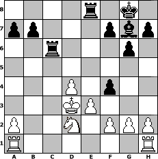 game notation in PGN-format [Event "1. CQS Clubmeisterschaft 2011"] [Site "www.myChess.de"] [Date "2011.07.30"] [Round "1"] [White "martinus"] [Black "Fighter"] [ECO "E60"] [WhitemyELO "1736"] [BlackmyELO "2178"] [Result "1/2-1/2"] [TimeControl "10/2592000"] [WhiteDays "28"] [BlackDays "27"] [MyChessNo "75270"] 1. d4 Nf6 2. c4 g6 3. Nf3 Bg7 4. Nc3 d5 5. Bg5 Ne4 6. Bf4 Nxc3 7. bxc3 c5 8. e3 O-O 9. Qb3 cxd4 10. cxd4 Qa5+ 11. Nd2 dxc4 12. Bxc4 Nd7 13. Qb5 Qxb5 14. Bxb5 e5 15. Bxd7 exf4 16. Bxc8 Raxc8 17. Ke2 Rfe8 18. Kd3 Rc6 1/2-1/2 position notation in FEN-format 4r1k1/pp3pbp/2r3p1/8/3P1p2/3KP3/P2N1PPP/R6R - - - 4 19 Captured white pieces: Captured black pieces: Click on a captured piece in order to display the desired move!