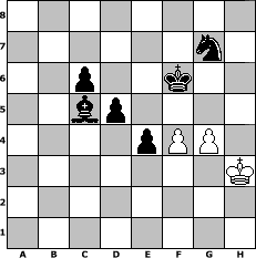 game notation in PGN-format [Event "Schach im Fr"] [Site "www.myChess.de"] [Date "2009.04.06"] [Round "1"] [White "sel"] [Black "beowulf"] [ECO "D10"] [WhitemyELO "1353"] [BlackmyELO "1358"] [Result "0-1"] [TimeControl "10/864000"] [WhiteDays "10"] [BlackDays "10"] [MyChessNo "54589"] 1. d4 d5 2. c4 c6 3. c5 Nd7 4. b4 e5 5. Bb2 e4 6. Bc1 h6 7. f3 f5 8. f4 Ngf6 9. e3 b6 10. h3 bxc5 11. bxc5 Rb8 12. Qa4 Qc7 13. Ba6 Be7 14. Ba3 O-O 15. Ne2 Bxa6 16. Qxa6 Rb7 17. O-O Rfb8 18. Nbc3 Kf7 19. Na4 Rg8 20. Rab1 Rxb1 21. Rxb1 Rb8 22. Nec3 Rxb1+ 23. Nxb1 g5 24. g3 Nb8 25. Qe2 Ke6 26. Nbc3 g4 27. hxg4 Nxg4 28. Bb2 Qd8 29. Nd1 h5 30. Nf2 Qg8 31. Nxg4 fxg4 32. Qh2 Qh8 33. Bc3 h4 34. Be1 h3 35. Kh1 Na6 36. a3 Qb8 37. Qb2 Qc8 38. Kh2 Bd8 39. Qf2 Kf5 40. Qb2 Nc7 41. Nc3 Ne6 42. Ne2 Bc7 43. a4 Ng7 44. a5 Qa6 45. Qa2 Qd3 46. Bf2 Bxa5 47. Ng1 Bd2 48. Qxa7 Kf6 49. Qd7 Qf1 50. Nxh3 gxh3 51. Qxh3 Qxf2+ 52. Qg2 Qxg2+ 53. Kxg2 Bxe3 54. Kh3 Bxd4 55. g4 Bxc5 0-1 position notation in FEN-format 8/6n1/2p2k2/2bp4/4pPP1/7K/8/8 - - - 0 56 Captured white pieces: Captured black pieces: Click on a captured piece in order to display the desired move!