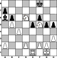 game notation in PGN-format [Event "ComeBack"] [Site "www.myChess.de"] [Date "2008.11.09"] [Round "1"] [White "Knight"] [Black "Ostseeboy"] [ECO "A45"] [WhitemyELO "1153"] [BlackmyELO "1292"] [Result "1-0"] [TimeControl "10/1728000"] [WhiteDays "79"] [BlackDays "79"] [MyChessNo "49662"] 1. d4 Nf6 2. Nc3 e6 3. e4 d6 4. Bg5 Be7 5. Nf3 O-O 6. Bd3 Nc6 7. O-O b6 8. e5 dxe5 9. dxe5 Bb7 10. exf6 Bxf6 11. Bxf6 Qxf6 12. Ne4 Qe7 13. Re1 Rad8 14. Nc3 Nb4 15. Re3 Nxd3 16. Rxd3 Rxd3 17. Qxd3 Rd8 18. Qe3 g6 19. h3 c5 20. Re1 Kg7 21. Qe5+ Kg8 22. Ng5 Rd6 23. Nge4 Rc6 24. Nd5 c4 25. Nef6+ Kg7 26. Nxe7 Rc5 27. Nd7+ Rxe5 28. Nxe5 f6 29. Nxc4 e5 30. Nd6 Ba6 31. c4 g5 32. b4 Kf8 33. Nef5 h5 34. b5 1-0 position notation in FEN-format 5k2/p7/bp1N1p2/1P2pNpp/2P5/7P/P2P1PP1/4R1K1 - - - 0 34 Captured white pieces: ![]() ![]() ![]() ![]() ![]() ![]() ![]() ![]() ![]() ![]() ![]() ![]() ![]() ![]() ![]() Captured black pieces: ![]() ![]() ![]() ![]() ![]() ![]() ![]() ![]() ![]() ![]() ![]() ![]() ![]() ![]() ![]() Click on a captured piece in order to display the desired move!