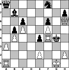 game notation in PGN-format [Event "Aljechin Verteidigung"] [Site "www.myChess.de"] [Date "2006.01.30"] [Round "2"] [White "Look"] [Black "Juri"] [ECO "B03"] [WhitemyELO "1769"] [BlackmyELO "1589"] [Result "1-0"] [TimeControl "10/864000"] [WhiteDays "40"] [BlackDays "39"] [MyChessNo "22069"] 1. e4 Nf6 2. e5 Nd5 3. d4 e6 4. c4 Nb6 5. Nf3 d5 6. c5 Nc4 7. Bxc4 dxc4 8. Qa4+ c6 9. Qxc4 b5 10. cxb6 axb6 11. O-O Ba6 12. Qa4 b5 13. Qc2 Bb4 14. a3 Qa5 15. Nbd2 Be7 16. b4 Qa4 17. Qc3 O-O 18. Ne4 Bb7 19. Bg5 f6 20. exf6 gxf6 21. Bh6 Rf7 22. Nc5 Bxc5 23. dxc5 Nd7 24. Nd4 e5 25. Qg3+ Kh8 26. Nf5 Rg8 27. Qc3 Qa8 28. Qb3 Rfg7 29. Bxg7+ Rxg7 30. Nxg7 Kxg7 31. Qe6 Nf8 32. Qe7+ Kg6 33. f4 e4 34. f5+ Kg5 35. Qg7+ Kh5 36. g4+ Kh4 37. Qh6+ Kxg4 38. Rf4# 1-0 position notation in FEN-format q4n2/1b5p/2p2p1Q/1pP2P2/1P2pRk1/P7/4P2P/R5K1 - - - 1 38 Captured white pieces: Captured black pieces: Click on a captured piece in order to display the desired move!