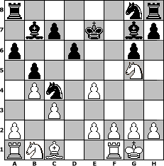 game notation in PGN-format [Event "Jagdvariante"] [Site "www.myChess.de"] [Date "2004.02.23"] [Round "1"] [White "baltruma"] [Black "kalle"] [ECO "C70"] [WhitemyELO "1563"] [BlackmyELO "1673"] [Result "0-1"] [TimeControl "10/2592000"] [WhiteDays "60"] [BlackDays "60"] [MyChessNo "2432"] 1. e4 e5 2. Nf3 Nc6 3. Bb5 a6 4. Ba4 b5 5. Bb3 Na5 6. O-O d6 7. d4 exd4 8. Nxd4 Bb7 9. Bxf7+ Kxf7 10. Qh5+ g6 11. Qf3+ Qf6 12. b4 Qxf3 13. Nxf3 Bg7 14. c3 Nc4 15. Ng5+ Ke7 0-1 position notation in FEN-format r5nr/1bp1k1bp/p2p2p1/1p4N1/1Pn1P3/2P5/P3PPPP/RNB2RK1 - - - 3 16 Captured white pieces: Captured black pieces: Click on a captured piece in order to display the desired move!