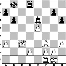 game notation in PGN-format [Event "Der Mann mit dem Goldenen Colt"] [Site "www.myChess.de"] [Date "2010.08.18"] [Round "1"] [White "muetoe"] [Black "paul"] [ECO "D02"] [WhitemyELO "1842"] [BlackmyELO "1266"] [Result "1-0"] [TimeControl "10/3456000"] [WhiteDays "112"] [BlackDays "075"] [MyChessNo "67719"] 1. d4 d5 2. Nf3 Nc6 3. c4 e6 4. Nc3 Bb4 5. Bg5 Nf6 6. a3 Bxc3+ 7. bxc3 dxc4 8. e4 h6 9. Bxf6 Qxf6 10. Bxc4 Bd7 11. O-O O-O-O 12. h3 Ne7 13. Qc2 Qg6 14. Ne5 Qh5 15. Be2 Qh4 16. Nxf7 e5 17. dxe5 Nc6 18. Rab1 Na5 19. Qd3 Be6 20. Nxd8 Rxd8 21. Qb5 b6 22. Qa6+ Kb8 23. Qxa5 Qxe4 24. Bf3 Qc4 25. Rb4 Qxc3 26. Rxb6+ cxb6 27. Qxc3 1-0 position notation in FEN-format 1k1r4/p5p1/1p2b2p/4P3/8/P1Q2B1P/3P1PP1/5RK1 - - - 0 27 Captured white pieces: Captured black pieces: Click on a captured piece in order to display the desired move!