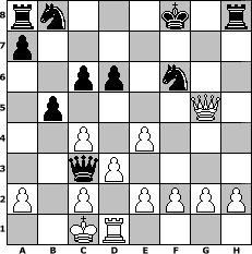 game notation in PGN-format [Event "Spring 2017"] [Site "www.myChess.de"] [Date "2017.03.21"] [Round "1"] [White "Knight"] [Black "sprinterde"] [ECO "C24"] [WhitemyELO "1181"] [BlackmyELO "1731"] [Result "0-1"] [TimeControl "10/2592000"] [WhiteDays "60"] [BlackDays "59"] [MyChessNo "107415"] 1. e4 e5 2. Bc4 Nf6 3. Nc3 Bc5 4. Nf3 c6 5. d3 b5 6. Bxf7+ Kxf7 7. Nxe5+ Kf8 8. Bg5 Bd4 9. Qf3 Bxe5 10. O-O-O Bxc3 11. bxc3 h6 12. Bh4 d6 13. c4 Bg4 14. Qf4 Bxd1 15. Rxd1 g5 16. Bxg5 hxg5 17. Qe3 Qa5 18. Qxg5 Qc3 0-1 position notation in FEN-format rn3k1r/p7/2pp1n2/1p4Q1/2P1P3/2qP4/P1P1PPPP/2KR4 - - - 1 19 Captured white pieces: ![]() ![]() ![]() ![]() ![]() ![]() ![]() ![]() ![]() ![]() ![]() ![]() ![]() ![]() ![]() Captured black pieces: ![]() ![]() ![]() ![]() ![]() ![]() ![]() ![]() ![]() ![]() ![]() ![]() ![]() ![]() ![]() Click on a captured piece in order to display the desired move!