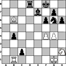 game notation in PGN-format [Event "MySchachOpen"] [Site "www.myChess.de"] [Date "2005.01.22"] [Round "2"] [White "tschulz"] [Black "UPS"] [ECO "A00"] [WhitemyELO "1514"] [BlackmyELO "1638"] [Result "0-1"] [TimeControl "10/2592000"] [WhiteDays "054"] [BlackDays "133"] [MyChessNo "9908"] 1. b4 a6 2. Bb2 d5 3. e3 Bd7 4. a4 e6 5. Nh3 Nf6 6. b5 c6 7. Bd3 axb5 8. axb5 Rxa1 9. Bxa1 cxb5 10. O-O b4 11. c3 Qa5 12. Bb2 Qa2 13. Qc1 Nc6 14. c4 Be7 15. c5 O-O 16. Ng5 e5 17. e4 h6 18. exd5 Qxd5 19. Bc4 Qxc5 20. Nf3 e4 21. d4 exd3 22. Bxd3 Qxc1 23. Rxc1 Be6 24. Nbd2 Rc8 25. h4 Rd8 26. Bb5 Bd5 27. Re1 Kf8 28. Nh2 Na7 29. Ba4 Bc6 30. Bxc6 bxc6 31. Ndf3 c5 32. Ne5 Nd5 33. h5 Nf4 34. g4 f6 35. Ng6+ Nxg6 36. hxg6 c4 37. Bc1 c3 38. Be3 Nc6 39. Rb1 Ne5 40. f4 Nxg6 41. Bb6 c2 0-1 position notation in FEN-format 3r1k2/4b1p1/1B3pnp/8/1p3PP1/8/2p4N/1R4K1 - - - 0 42 Captured white pieces: Captured black pieces: Click on a captured piece in order to display the desired move!