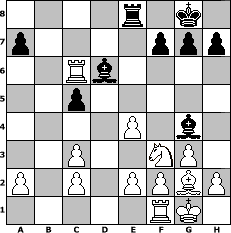 game notation in PGN-format [Event "Ja, is denn heut scho Weihnachten?"] [Site "www.myChess.de"] [Date "2014.12.06"] [Round "1"] [White "Wernburger"] [Black "Knight"] [ECO "A36"] [WhitemyELO "1835"] [BlackmyELO "1316"] [Result "1-0"] [TimeControl "10/2592000"] [WhiteDays "60"] [BlackDays "60"] [MyChessNo "97056"] 1. c4 c5 2. Nc3 Nc6 3. g3 Nf6 4. Bg2 e5 5. d3 Be7 6. Nf3 d5 7. cxd5 Nxd5 8. O-O Nxc3 9. bxc3 O-O 10. Rb1 e4 11. dxe4 Bg4 12. Rxb7 Rb8 13. Qxd8 Rbxd8 14. Rc7 Rd6 15. Bf4 Re8 16. Bxd6 Bxd6 17. Rxc6 1-0 position notation in FEN-format 4r1k1/p4ppp/2Rb4/2p5/4P1b1/2P2NP1/P1P1PPBP/5RK1 - - - 0 17 Captured white pieces: ![]() ![]() ![]() ![]() ![]() ![]() ![]() ![]() ![]() ![]() ![]() ![]() ![]() ![]() ![]() Captured black pieces: ![]() ![]() ![]() ![]() ![]() ![]() ![]() ![]() ![]() ![]() ![]() ![]() ![]() ![]() ![]() Click on a captured piece in order to display the desired move!
