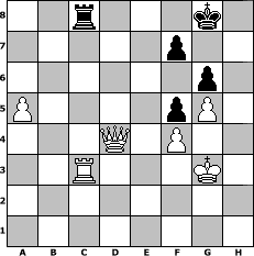 game notation in PGN-format [Event "Schlusslichterturnier Nr.2"] [Site "www.myChess.de"] [Date "2010.10.25"] [Round "1"] [White "hape50"] [Black "reisender"] [ECO "D00"] [WhitemyELO "1352"] [BlackmyELO "1370"] [Result "1-0"] [TimeControl "10/2592000"] [WhiteDays "30"] [BlackDays "30"] [MyChessNo "69289"] 1. d4 d5 2. e3 Nc6 3. Nf3 Nf6 4. Bb5 Bd7 5. a3 g6 6. Nc3 a6 7. Bd3 Bg7 8. O-O Bg4 9. Be2 e6 10. Ng5 Bxe2 11. Qxe2 O-O 12. f4 Na5 13. Rf3 Ne4 14. Ncxe4 dxe4 15. Nxe4 b5 16. Bd2 Nc4 17. Bc3 Nd6 18. Nc5 Nf5 19. Qf2 h5 20. Ne4 a5 21. Nc5 c6 22. Ne4 Re8 23. Be1 Qd5 24. Nc3 Qd6 25. h3 b4 26. Ne4 Qb8 27. g4 hxg4 28. hxg4 Ne7 29. Qh4 Kf8 30. Nf6 Bxf6 31. g5 Bg7 32. c3 Ng8 33. Bd2 bxc3 34. Bxc3 Qb5 35. Raf1 c5 36. R1f2 cxd4 37. exd4 Rad8 38. Kg2 Ke7 39. b4 axb4 40. Rb2 Rc8 41. Qh7 Kf8 42. Bxb4+ Qxb4 43. Rxb4 Rc2+ 44. Kg3 Ne7 45. Rb5 Nf5+ 46. Rxf5 exf5 47. Qh1 Bxd4 48. Qd1 Rc4 49. a4 Rd8 50. Qb3 Rdc8 51. a5 Rc3 52. Qb4+ Kg7 53. Qxd4+ Kg8 54. Rxc3 1-0 position notation in FEN-format 2r3k1/5p2/6p1/P4pP1/3Q1P2/2R3K1/8/8 - - - 0 54 Captured white pieces: Captured black pieces: Click on a captured piece in order to display the desired move!