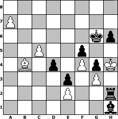 game notation in PGN-format [Event "Sweschnikow III"] [Site "www.myChess.de"] [Date "2012.09.05"] [Round "1"] [White "Achimkogge"] [Black "Naunhofer"] [ECO "B33"] [WhitemyELO "1447"] [BlackmyELO "1627"] [Result "0-1"] [TimeControl "10/1728000"] [WhiteDays "19"] [BlackDays "20"] [MyChessNo "83754"] 1. e4 c5 2. Nf3 Nc6 3. d4 cxd4 4. Nxd4 Nf6 5. Nc3 e5 6. Nb3 Bb4 7. a3 Bxc3+ 8. bxc3 Nxe4 9. Qf3 d5 10. Bb5 O-O 11. O-O Qf6 12. Qxf6 Nxf6 13. Bxc6 bxc6 14. f3 Ba6 15. Re1 Nd7 16. Na5 Rac8 17. h4 f5 18. g3 e4 19. f4 Rc7 20. Be3 Nb6 21. Nb3 Nc4 22. Nc5 Bc8 23. Bc1 Kf7 24. Kh2 Nd6 25. a4 Nb7 26. Na6 Rd7 27. Ba3 Re8 28. h5 Re6 29. Bc5 Rh6 30. Rh1 Nd8 31. Nb4 Rxh5+ 32. Kg2 Rxh1 33. Rxh1 a5 34. Na2 Ne6 35. Bb6 h6 36. Nc1 Rb7 37. Bxa5 Rb2 38. Kh3 Rxc2 39. Nb3 g5 40. Nd4 Nxd4 41. cxd4 g4+ 42. Kh4 Kg6 43. Bb4 Rc4 44. Bc5 Rc2 45. a5 e3 46. Bb4 Ba6 47. Be1 c5 48. dxc5 d4 49. Bb4 Bb7 50. a6 Bxh1 51. a7 Rh2# 0-1 position notation in FEN-format 8/P7/6kp/2P2p2/1B1p1PpK/4p1P1/4P2r/7b - - - 1 52 Captured white pieces: Captured black pieces: Click on a captured piece in order to display the desired move!