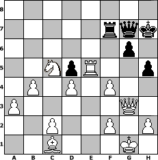 | game notation in PGN-format [Event "Mail"] [Site "www.myChess.de"] [Date "2012.05.01"] [Round "1"] [White "Seneca"] [Black "hape50"] [ECO "A13"] [WhitemyELO "1353"] [BlackmyELO "1265"] [Result "1-0"] [TimeControl "10/864000"] [WhiteDays "05"] [BlackDays "10"] [MyChessNo "81382"] 1. c4 e6 2. d4 h6 3. e3 Nf6 4. Bd3 d6 5. Nf3 c6 6. O-O Be7 7. Nc3 Nbd7 8. a3 O-O 9. b4 a6 10. Bb2 Nb6 11. c5 Nbd5 12. cxd6 Qxd6 13. Na4 Bd7 14. g3 Nh7 15. e4 b5 16. exd5 cxd5 17. Nc5 Bc6 18. Bxh7+ Kxh7 19. Ne5 Ra7 20. Nxc6 Qxc6 21. Re1 f5 22. Rxe6 Qe8 23. Nxa6 Rf6 24. Rxf6 Bxf6 25. Nc5 g6 26. Qf1 h5 27. Re1 Qc6 28. Re6 Qc7 29. Rxf6 Qe7 30. Re6 Qf7 31. Qxb5 f4 32. Qd3 Rc7 33. gxf4 Qg8 34. Qg3 Rf7 35. Bc1 Qg7 36. Re5 1-0 position notation in FEN-format 8/5rqk/6p1/2NpR2p/1P1P1P2/P5Q1/2P2P1P/2B3K1 - - - 6 36 Captured white pieces:                              Captured black pieces:                               Click on a captured piece in order to display the desired move!