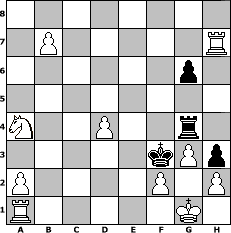 game notation in PGN-format [Event "Tigran (Wartanowitsch)Petrosjan Turnier"] [Site "www.myChess.de"] [Date "2009.08.09"] [Round "1"] [White "Ostseeboy"] [Black "Hobbykegler"] [ECO "A00"] [WhitemyELO "1262"] [BlackmyELO "1093"] [Result "1-0"] [TimeControl "10/2592000"] [WhiteDays "118"] [BlackDays "115"] [MyChessNo "58135"] 1. b4 Nf6 2. Bb2 g6 3. Nf3 Bh6 4. e3 O-O 5. Be2 Ng4 6. O-O d6 7. Nc3 f5 8. Bc4+ e6 9. Qe2 Ne5 10. Nxe5 f4 11. Ng4 Bg7 12. exf4 Rxf4 13. Bxe6+ Bxe6 14. Qxe6+ Kh8 15. Na4 h5 16. Bxg7+ Kxg7 17. Ne3 Qg5 18. Nd5 Rg4 19. Qe7+ Kh6 20. Qxg5+ Rxg5 21. Nf4 Nc6 22. Rfe1 h4 23. c4 Nxb4 24. Re7 Nd3 25. Rxc7 Rf8 26. Nxd3 h3 27. g3 Rf3 28. Nb4 a5 29. Nd5 b5 30. Nab6 Kh5 31. cxb5 a4 32. Rh7+ Kg4 33. Ne3+ Rxe3 34. dxe3 Kf3 35. Nxa4 d5 36. b6 d4 37. exd4 Rg4 38. b7 1-0 position notation in FEN-format 8/1P5R/6p1/8/N2P2r1/5kPp/P4P1P/R5K1 - - - 0 38 Captured white pieces: Captured black pieces: Click on a captured piece in order to display the desired move!