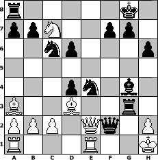 game notation in PGN-format [Event "4. Norderstedter DENK MAL Open 2013"] [Site "www.myChess.de"] [Date "2013.01.09"] [Round "1"] [White "Steppenwolf"] [Black "Vahl1"] [ECO "C42"] [WhitemyELO "1178"] [BlackmyELO "1656"] [Result "0-1"] [TimeControl "10/2592000"] [WhiteDays "27"] [BlackDays "25"] [MyChessNo "86063"] 1. e4 e5 2. Nf3 Nf6 3. Nc3 Nc6 4. Bc4 h6 5. d4 Bb4 6. Bd2 d6 7. O-O exd4 8. Nd5 Nxe4 9. Re1 Bf5 10. Bxb4 O-O 11. Bd3 Re8 12. Ba3 Re6 13. Nh4 Qxh4 14. Nxc7 Qxf2+ 15. Kh1 Rg6 16. g3 Rxg3 17. Qe2 Bg4 0-1 position notation in FEN-format r5k1/ppN2pp1/2np3p/8/3pn1b1/B2B2r1/PPP1Qq1P/R3R2K - - - 2 18 Captured white pieces: Captured black pieces: Click on a captured piece in order to display the desired move!