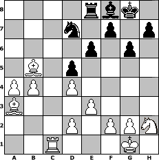 game notation in PGN-format [Event "Mal wieder spielen 2"] [Site "www.myChess.de"] [Date "2013.05.12"] [Round "1"] [White "Naunhofer"] [Black "Seneca"] [ECO "D02"] [WhitemyELO "1689"] [BlackmyELO "1570"] [Result "1-0"] [TimeControl "10/1728000"] [WhiteDays "55"] [BlackDays "54"] [MyChessNo "88263"] 1. d4 d5 2. Nf3 Nf6 3. c4 c6 4. e3 g6 5. Nc3 Bg7 6. Be2 O-O 7. O-O Bf5 8. b4 Qc7 9. a4 a6 10. Qb3 Ne4 11. Nxe4 Bxe4 12. Ba3 Re8 13. Rac1 b6 14. cxd5 Bxd5 15. Qxd5 Qxh2+ 16. Nxh2 cxd5 17. Rc7 e6 18. Rfc1 Bf8 19. Rb7 Re7 20. Rxb6 Nd7 21. Rxa6 Rxa6 22. Bxa6 Re8 23. Bb5 1-0 position notation in FEN-format 4rbk1/3n1p1p/4p1p1/1B1p4/PP1P4/B3P3/3P1PPN/2R3K1 - - - 2 23 Captured white pieces: Captured black pieces: Click on a captured piece in order to display the desired move!