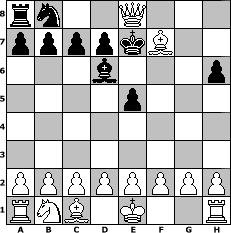 game notation in PGN-format [Event "Winterende2014"] [Site "www.myChess.de"] [Date "2014.03.06"] [Round "2"] [White "faustballer"] [Black "Haneken"] [ECO "C40"] [WhitemyELO "1532"] [BlackmyELO "1037"] [Result "1-0"] [TimeControl "10/1728000"] [WhiteDays "40"] [BlackDays "33"] [MyChessNo "93409"] 1. e4 e5 2. Nf3 Bd6 3. Bc4 Nf6 4. Ng5 h6 5. Nxf7 Qe7 6. Nxh8 Nxe4 7. Qh5+ Kf8 8. Ng6+ Ke8 9. Nxe7+ Kd8 10. Nxc8 Nf6 11. Qf7 Kxc8 12. Qxg7 Ne8 13. Qh8 Kd8 14. Bf7 Ke7 15. Qxe8+ 1-0 position notation in FEN-format rn2Q3/ppppkB2/3b3p/4p3/8/8/PPPPPPPP/RNB1K2R - KQ - 0 15 Captured white pieces: Captured black pieces: Click on a captured piece in order to display the desired move!