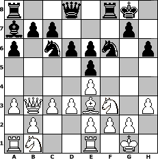 game notation in PGN-format [Event "Neujahrsturnier 2007"] [Site "www.myChess.de"] [Date "2007.01.01"] [Round "1"] [White "Andylein1989"] [Black "jlarue700"] [ECO "C50"] [WhitemyELO "1406"] [BlackmyELO "1567"] [Result "1/2-1/2"] [TimeControl "10/864000"] [WhiteDays "17"] [BlackDays "18"] [MyChessNo "31296"] 1. e4 e5 2. Nf3 Nc6 3. Bc4 h6 4. d3 Nf6 5. h3 Bc5 6. c3 a6 7. a3 d6 8. O-O O-O 9. Re1 Be6 10. Bxe6 fxe6 11. Be3 Ba7 12. Qb3 1/2-1/2 position notation in FEN-format r2q1rk1/bpp3p1/p1nppn1p/4p3/4P3/PQPPBN1P/1P2PPP1/RN2R1K1 - - - 3 12 Captured white pieces: Captured black pieces: Click on a captured piece in order to display the desired move!