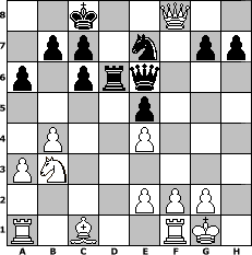 game notation in PGN-format [Event "Bobby Fischer lebt Teil 2"] [Site "www.myChess.de"] [Date "2009.09.02"] [Round "1"] [White "Haki"] [Black "Ziegert"] [ECO "C69"] [WhitemyELO "1510"] [BlackmyELO "1573"] [Result "1-0"] [TimeControl "10/2592000"] [WhiteDays "56"] [BlackDays "02"] [MyChessNo "58739"] 1. e4 e5 2. Nf3 Nc6 3. Bb5 a6 4. Bxc6 dxc6 5. O-O f6 6. d3 Bg4 7. Nbd2 Bd6 8. h3 Be6 9. c4 Qd7 10. a3 O-O-O 11. b4 Ne7 12. Nb3 f5 13. c5 fxe4 14. dxe4 Bxh3 15. Ng5 Be6 16. Nxe6 Qxe6 17. cxd6 Rxd6 18. Qf3 Rf8 19. Qxf8+ 1-0 position notation in FEN-format 2k2Q2/1pp1n1pp/p1prq3/4p3/1P2P3/PN6/4PPP1/R1B2RK1 - - - 0 19 Captured white pieces: Captured black pieces: Click on a captured piece in order to display the desired move!