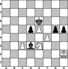 game notation in PGN-format [Event "4. Norderstedter DENK MAL Open 2013"] [Site "www.myChess.de"] [Date "2013.01.09"] [Round "1"] [White "sprinterde"] [Black "Vahl1"] [ECO "A40"] [WhitemyELO "1686"] [BlackmyELO "1656"] [Result "1/2-1/2"] [TimeControl "10/2592000"] [WhiteDays "30"] [BlackDays "30"] [MyChessNo "86049"] 1. d4 g6 2. e4 Bg7 3. Nc3 d6 4. Nf3 a6 5. Be2 Nc6 6. O-O e5 7. Bg5 Qd7 8. d5 Nd4 9. Bd3 Nf6 10. Nxd4 exd4 11. Ne2 O-O 12. f3 b5 13. Bh4 Bb7 14. Bf2 Rfe8 15. Bxd4 c6 16. dxc6 Bxc6 17. Kh1 b4 18. a3 a5 19. axb4 axb4 20. Rxa8 Rxa8 21. Qd2 Qb7 22. b3 Re8 23. Ra1 Ra8 24. Rxa8+ Qxa8 25. Qxb4 d5 26. e5 Nd7 27. Qe7 Bf8 28. Qg5 Nc5 29. Bf5 Qa5 30. Ng1 Ne6 31. Bxe6 fxe6 32. Nh3 Qb4 33. c3 Qxb3 34. Nf4 Qb1+ 35. Bg1 Qf5 36. Qxf5 exf5 37. g3 Kf7 38. Bd4 Bh6 39. Nd3 Bb5 40. Nb4 Ke6 41. Kg2 f4 42. h4 fxg3 43. Kxg3 Bd2 44. Kg4 h5+ 45. Kg3 Be1+ 46. Kh3 Bf1+ 47. Kh2 Bxh4 48. Nc2 Bg5 49. Be3 Bxe3 50. Nxe3 Bd3 51. f4 g5 1/2-1/2 position notation in FEN-format 8/8/4k3/3pP1pp/5P2/2PbN3/7K/8 - - - 0 52 Captured white pieces: Captured black pieces: Click on a captured piece in order to display the desired move!