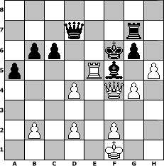 game notation in PGN-format [Event "Sommer 2010 Teil 2"] [Site "www.myChess.de"] [Date "2010.06.24"] [Round "1"] [White "Koprek"] [Black "deepsabel"] [ECO "D54"] [WhitemyELO "1890"] [BlackmyELO "2021"] [Result "1-0"] [TimeControl "10/1728000"] [WhiteDays "74"] [BlackDays "49"] [MyChessNo "66503"] 1. d4 d5 2. c4 e6 3. Nc3 Nf6 4. Bg5 Be7 5. e3 Nbd7 6. Rc1 O-O 7. Nf3 c6 8. Bd3 dxc4 9. Bxc4 Nd5 10. Bxe7 Qxe7 11. O-O Nxc3 12. Rxc3 e5 13. Qc2 exd4 14. exd4 Nb6 15. Re1 Qd8 16. Bb3 Nd5 17. Bxd5 Qxd5 18. Rc5 Qxa2 19. Ng5 g6 20. Qc3 b6 21. Rce5 f6 22. Re7 Qd5 23. Nxh7 Rf7 24. Rxf7 Kxf7 25. Qe3 Be6 26. Qf4 Bf5 27. Nxf6 Kxf6 28. Re5 Qd7 29. g4 Rg8 30. h4 a5 31. Kf1 Rg7 32. h5 1-0 position notation in FEN-format 8/3q2r1/1pp2kp1/p3Rb1P/3P1QP1/8/1P1P1P2/5K2 - - - 0 32 Captured white pieces: ![]() ![]() ![]() ![]() ![]() ![]() ![]() ![]() ![]() ![]() ![]() ![]() ![]() ![]() ![]() Captured black pieces: ![]() ![]() ![]() ![]() ![]() ![]() ![]() ![]() ![]() ![]() ![]() ![]() ![]() ![]() ![]() Click on a captured piece in order to display the desired move!