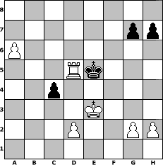 game notation in PGN-format [Event "Fr"] [Site "www.myChess.de"] [Date "2017.02.25"] [Round "1"] [White "Naunhofer"] [Black "miu"] [ECO "E21"] [WhitemyELO "1631"] [BlackmyELO "1526"] [Result "1-0"] [TimeControl "10/2592000"] [WhiteDays "120"] [BlackDays "118"] [MyChessNo "107138"] 1. d4 Nf6 2. c4 e6 3. Nc3 Bb4 4. Nf3 d5 5. e3 c5 6. dxc5 Bxc3+ 7. bxc3 Nc6 8. cxd5 exd5 9. Bb5 O-O 10. Nd4 Bd7 11. Qb3 Qa5 12. Bxc6 bxc6 13. Qb4 Qa6 14. a4 Rab8 15. Qa3 Qa5 16. O-O Ne4 17. Rd1 Qxc5 18. Qxc5 Nxc5 19. Ba3 Nb3 20. Nxb3 Rxb3 21. Bxf8 Kxf8 22. c4 Be6 23. cxd5 Bxd5 24. a5 Rb5 25. Rdb1 a6 26. f3 f5 27. Re1 c5 28. e4 fxe4 29. fxe4 Be6 30. Kf2 Ke7 31. Red1 Kf6 32. Rd6 c4 33. Rxa6 Ke5 34. Rb6 Bd7 35. Rxb5+ Bxb5 36. Ke3 Bc6 37. a6 Bxe4 38. Ra5+ Bd5 39. Rxd5+ 1-0 position notation in FEN-format 8/6pp/P7/3Rk3/2p5/4K3/3P2PP/8 - - - 0 39 Captured white pieces: Captured black pieces: Click on a captured piece in order to display the desired move!