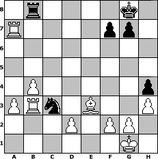 game notation in PGN-format [Event "Turnier zum Tag der deutschen Einheit 2015"] [Site "www.myChess.de"] [Date "2015.10.03"] [Round "1"] [White "Gauss1233"] [Black "paul"] [ECO "D06"] [WhitemyELO "1383"] [BlackmyELO "1348"] [Result "1-0"] [TimeControl "10/1728000"] [WhiteDays "60"] [BlackDays "13"] [MyChessNo "100619"] 1. d4 d5 2. c4 Nf6 3. Nc3 dxc4 4. e4 e5 5. d5 Bd6 6. Bxc4 Na6 7. Bxa6 bxa6 8. a3 Bb7 9. Nf3 Rc8 10. O-O Qd7 11. h3 c6 12. dxc6 Rxc6 13. Re1 Rc4 14. Qd3 Rc6 15. Rd1 O-O 16. Nxe5 Qe6 17. Nxc6 Bxc6 18. Qxd6 Qxd6 19. Rxd6 Bxe4 20. Nxe4 Nxe4 21. Rxa6 Rd8 22. Be3 Rb8 23. b4 h5 24. Rxa7 h4 25. Rb1 Nc3 26. Rb3 1-0 position notation in FEN-format 1r4k1/R4pp1/8/8/1P5p/PRn1B2P/3P1PP1/6K1 - - - 3 26 Captured white pieces: Captured black pieces: Click on a captured piece in order to display the desired move!