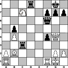 game notation in PGN-format [Event "GPA"] [Site "www.myChess.de"] [Date "2016.11.27"] [Round "1"] [White "shan"] [Black "Knight"] [ECO "C78"] [WhitemyELO "1510"] [BlackmyELO "1246"] [Result "1-0"] [TimeControl "10/1728000"] [WhiteDays "20"] [BlackDays "20"] [MyChessNo "105862"] 1. e4 e5 2. Nf3 Nc6 3. Bb5 a6 4. Ba4 Nf6 5. O-O b5 6. Bb3 Bc5 7. Ng5 d5 8. exd5 Nxd5 9. Qh5 Be6 10. Nxe6 Qf6 11. Nxc5 Rd8 12. Bxd5 Rxd5 13. b4 O-O 14. Qh3 Re8 15. Nc3 Rdd8 16. f4 exf4 17. Nxa6 Nd4 18. Nxc7 Ne2+ 19. Nxe2 Rxe2 20. Ba3 Rexd2 21. c3 R2d3 22. Qg4 Rxc3 23. Bb2 1-0 position notation in FEN-format 3r2k1/2N2ppp/5q2/1p6/1P3pQ1/2r5/PB4PP/R4RK1 - - - 1 23 Captured white pieces: Captured black pieces: Click on a captured piece in order to display the desired move!