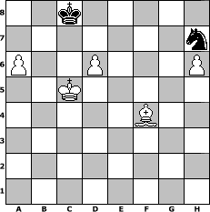 game notation in PGN-format [Event "Skandinavium II"] [Site "www.myChess.de"] [Date "2006.01.06"] [Round "1"] [White "Joschi"] [Black "rikilatic"] [ECO "B01"] [WhitemyELO "1720"] [BlackmyELO "1569"] [Result "1-0"] [TimeControl "10/864000"] [WhiteDays "09"] [BlackDays "10"] [MyChessNo "21436"] 1. e4 d5 2. exd5 Qxd5 3. Nc3 Qe5+ 4. Be2 c6 5. Nf3 Qc7 6. d4 Bf5 7. Be3 e6 8. Nh4 Bb4 9. Bd2 Bxc3 10. Bxc3 Nf6 11. Nxf5 exf5 12. Bb4 Nbd7 13. Qd3 O-O-O 14. Qxf5 Rde8 15. Qd3 Re6 16. O-O-O Rhe8 17. Bf3 Nd5 18. Bxd5 cxd5 19. g3 Re2 20. Rde1 Rxe1+ 21. Rxe1 Rxe1+ 22. Bxe1 g6 23. Bd2 Nf6 24. Bf4 Qa5 25. Qc3+ Qxc3 26. bxc3 Ne4 27. Be3 Nxc3 28. Kb2 Ne4 29. Kb3 h5 30. Kb4 Kc7 31. f3 Nf6 32. Bg5 Nd7 33. Bf4+ Kc6 34. c4 dxc4 35. Kxc4 Nb6+ 36. Kd3 Nd5 37. Bd2 b5 38. g4 hxg4 39. fxg4 b4 40. h4 a5 41. h5 gxh5 42. gxh5 Nf6 43. h6 Nh7 44. Kc4 f6 45. d5+ Kb7 46. Kb5 Kc7 47. Bf4+ Kb7 48. Kxa5 Nf8 49. Bd6 Nh7 50. Kxb4 Kc8 51. a4 Kd7 52. Bf4 f5 53. a5 Nf6 54. Kc4 Kc8 55. Kc5 Kb7 56. Be5 Nh7 57. d6 Kc8 58. a6 f4 59. Bxf4 1-0 position notation in FEN-format 2k5/7n/P2P3P/2K5/5B2/8/8/8 - - - 0 59 Captured white pieces: Captured black pieces: Click on a captured piece in order to display the desired move!