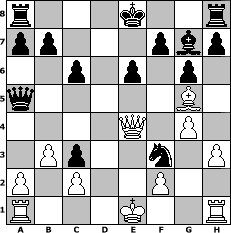 game notation in PGN-format [Event "Rechnerfrei B"] [Site "www.myChess.de"] [Date "2010.02.07"] [Round "1"] [White "Joschi"] [Black "espero"] [ECO "B06"] [WhitemyELO "1564"] [BlackmyELO "1773"] [Result "0-1"] [TimeControl "10/1728000"] [WhiteDays "37"] [BlackDays "23"] [MyChessNo "63001"] 1. e4 g6 2. d4 Bg7 3. Nf3 c6 4. Nc3 d5 5. e5 Bg4 6. Be2 e6 7. h3 Bxf3 8. Bxf3 Nd7 9. Be3 Ne7 10. Qd2 Nf5 11. Bg5 Qa5 12. g4 Nxd4 13. Qxd4 Nxe5 14. Qe3 d4 15. Qe4 dxc3 16. b3 Nxf3+ 0-1 position notation in FEN-format r3k2r/pp3pbp/2p1p1p1/q5B1/4Q1P1/1Pp2n1P/P1P2P2/R3K2R - KQkq - 0 17 Captured white pieces: ![]() ![]() ![]() ![]() ![]() ![]() ![]() ![]() ![]() ![]() ![]() ![]() ![]() ![]() ![]() Captured black pieces: ![]() ![]() ![]() ![]() ![]() ![]() ![]() ![]() ![]() ![]() ![]() ![]() ![]() ![]() ![]() Click on a captured piece in order to display the desired move!