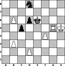 game notation in PGN-format [Event "Sommer 2015"] [Site "www.myChess.de"] [Date "2015.06.16"] [Round "1"] [White "Robur"] [Black "sprinterde"] [ECO "A40"] [WhitemyELO "1836"] [BlackmyELO "1720"] [Result "1-0"] [TimeControl "10/1728000"] [WhiteDays "54"] [BlackDays "51"] [MyChessNo "99467"] 1. d4 e6 2. c4 Nf6 3. Nc3 c5 4. Nf3 Nc6 5. d5 exd5 6. Nxd5 Be7 7. Nxe7 Qxe7 8. Bg5 h6 9. Bf4 O-O 10. Bd6 Qd8 11. Bxf8 Kxf8 12. Qd6+ Qe7 13. Qxe7+ Kxe7 14. a3 d6 15. e3 Bg4 16. Be2 Re8 17. h3 Bxf3 18. Bxf3 Ne5 19. Be2 Ne4 20. Rd1 f5 21. O-O g6 22. Kh2 Kd7 23. g4 fxg4 24. hxg4 g5 25. Kg2 Nf6 26. Rh1 Nexg4 27. Bxg4+ Nxg4 28. Kg3 Ne5 29. Rxh6 Re6 30. Rxe6 Kxe6 31. b3 a6 32. a4 Nf7 33. Kg4 b6 34. Kh5 Ke5 35. f3 Ke6 36. Rd5 b5 37. f4 gxf4 38. exf4 Kf6 39. axb5 axb5 40. cxb5 Ke6 41. b6 Nd8 42. Rg5 1-0 position notation in FEN-format 3n4/8/1P1pk3/2p3RK/5P2/1P6/3P4/8 - - - 2 42 Captured white pieces: Captured black pieces: Click on a captured piece in order to display the desired move!