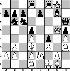 game notation in PGN-format [Event "Chess960 f"] [Site "www.myChess.de"] [Date "2013.03.24"] [Round "1"] [White "Teresa"] [Black "espero"] [Variant "Fischerrandom"] [SetUp "1"] [FEN "nnqrkbbr/pppppppp/8/8/8/8/PPPPPPPP/NNQRKBBR w KQkq - 0 1"] [WhitemyELO "1556"] [BlackmyELO "1727"] [Result "0-1"] [TimeControl "10/2592000"] [WhiteDays "21"] [BlackDays "29"] [MyChessNo "87399"] 1. d4 f5 2. Nb3 g6 3. f3 Bg7 4. h4 h5 5. Nc3 Nb6 6. e4 Nc6 7. exf5 Bxb3 8. cxb3 d5 9. Bd3 gxf5 10. Qg5 Qe6+ 11. Ne2 O-O 12. Rh3 f4 13. Kf1 Qh6 0-1 position notation in FEN-format 3r1rk1/ppp1p1b1/1nn4q/3p2Qp/3P1p1P/1P1B1P1R/PP1PN1P1/3R1KB1 - - - 2 14 Captured white pieces: Captured black pieces: Click on a captured piece in order to display the desired move!