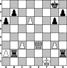 game notation in PGN-format [Event "Mittelklasse-Turnier"] [Site "www.myChess.de"] [Date "2007.10.20"] [Round "1"] [White "TAR"] [Black "brucybabe"] [ECO "B24"] [WhitemyELO "1278"] [BlackmyELO "1520"] [Result "1/2-1/2"] [TimeControl "10/864000"] [WhiteDays "09"] [BlackDays "10"] [MyChessNo "39118"] 1. e4 c5 2. Nc3 Nc6 3. g3 e6 4. Bg2 a6 5. d3 d6 6. f4 Nf6 7. Nf3 Be7 8. O-O O-O 9. Be3 d5 10. e5 d4 11. exf6 Bxf6 12. Bxd4 Nxd4 13. Ne5 Bxe5 14. fxe5 Qc7 15. Re1 Nc6 16. Qh5 g6 17. Qg5 Nd4 18. Rac1 Bd7 19. Ne4 f5 20. exf6 Bc6 21. Nxc5 Bxg2 22. Kxg2 Rae8 23. Re4 Qc6 24. c3 Nf5 25. d4 Nd6 26. Qh6 Rxf6 27. Re1 Nxe4 28. Nxe4 Ref8 29. Kg1 R6f7 30. Ng5 Re7 31. Rxe6 Qxe6 32. Nxe6 Rxe6 33. d5 Re1+ 34. Kg2 Re2+ 35. Kg1 Rff2 36. d6 Rxb2 37. Qe3 Rg2+ 38. Kf1 Rxh2 1/2-1/2 position notation in FEN-format 6k1/1p5p/p2P2p1/8/8/2P1Q1P1/Pr5r/5K2 - - - 0 39 Captured white pieces: Captured black pieces: Click on a captured piece in order to display the desired move!
