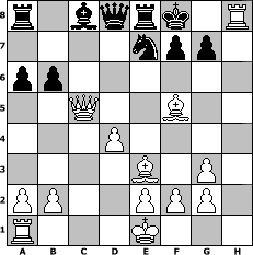 game notation in PGN-format [Event "Februar 2017"] [Site "www.myChess.de"] [Date "2017.02.05"] [Round "1"] [White "Andylein1989"] [Black "Master1"] [ECO "B10"] [WhitemyELO "1658"] [BlackmyELO "1313"] [Result "1-0"] [TimeControl "10/1728000"] [WhiteDays "60"] [BlackDays "53"] [MyChessNo "106756"] 1. e4 c6 2. Nf3 d5 3. exd5 cxd5 4. d4 Nf6 5. Bd3 Nc6 6. c3 e6 7. Nbd2 Bd6 8. Nf1 O-O 9. Ng3 Re8 10. Bd2 a6 11. Qc1 Bxg3 12. hxg3 e5 13. dxe5 Nxe5 14. Nxe5 Rxe5+ 15. Be3 d4 16. cxd4 Re8 17. Qc2 Nd5 18. Bxh7+ Kf8 19. Qc5+ Ne7 20. Bf5 b6 21. Rh8# 1-0 position notation in FEN-format r1bqrk1R/4npp1/pp6/2Q2B2/3P4/4B1P1/PP2PPP1/R3K3 - Q - 1 21 Captured white pieces: Captured black pieces: Click on a captured piece in order to display the desired move!