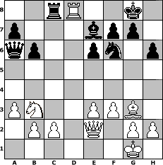 game notation in PGN-format [Event "Schach bei einem Schoppen Wein"] [Site "www.myChess.de"] [Date "2012.02.06"] [Round "1"] [White "pepo47"] [Black "Erich"] [ECO "A15"] [WhitemyELO "1966"] [BlackmyELO "2004"] [Result "1-0"] [TimeControl "10/1728000"] [WhiteDays "17"] [BlackDays "20"] [MyChessNo "79752"] 1. c4 Nf6 2. d4 e6 3. Nc3 d5 4. Nf3 Be7 5. Bg5 O-O 6. e3 h6 7. Bh4 dxc4 8. Bxc4 b6 9. O-O Bb7 10. Bg3 c5 11. Qe2 Nc6 12. Rad1 cxd4 13. Nxd4 Nxd4 14. Rxd4 Qc8 15. Nb5 Bc5 16. Rd3 Qc6 17. f3 Ba6 18. Nd4 Qb7 19. Bxa6 Qxa6 20. Nb3 Be7 21. Rfd1 Rad8 22. a3 Rxd3 23. Rxd3 Rc8 24. Rd8+ 1-0 position notation in FEN-format 2rR2k1/p3bpp1/qp2pn1p/8/8/PN2PPB1/1PP1Q1PP/6K1 - - - 2 24 Captured white pieces: Captured black pieces: Click on a captured piece in order to display the desired move!