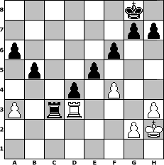 game notation in PGN-format [Event "Ende 2014"] [Site "www.myChess.de"] [Date "2014.12.20"] [Round "1"] [White "faustballer"] [Black "Tomino"] [ECO "B10"] [WhitemyELO "1536"] [BlackmyELO "1564"] [Result "0-1"] [TimeControl "10/2592000"] [WhiteDays "118"] [BlackDays "091"] [MyChessNo "97189"] 1. e4 c6 2. Bc4 d5 3. exd5 cxd5 4. Be2 Nf6 5. d3 e6 6. a3 Nc6 7. Nc3 Be7 8. Nf3 O-O 9. b4 a6 10. O-O b5 11. Bg5 Bb7 12. Bh4 Rc8 13. Rb1 Nxb4 14. Qd2 Nc6 15. Qc1 d4 16. Ne4 Nxe4 17. Bxe7 Nxe7 18. dxe4 Bxe4 19. Ne1 Nd5 20. Rb2 Nc3 21. Qd2 Nxe2+ 22. Qxe2 Bg6 23. Nd3 Qa5 24. Rb3 Rc3 25. Rfb1 Rfc8 26. Rxc3 Qxc3 27. Rb3 Qxc2 28. Qxc2 Rxc2 29. h3 Bxd3 30. Rxd3 e5 31. f4 f6 32. Kh2 Rc3 0-1 position notation in FEN-format 6k1/6pp/p4p2/1p2p3/3p1P2/P1rR3P/6PK/8 - - - 2 33 Captured white pieces: Captured black pieces: Click on a captured piece in order to display the desired move!