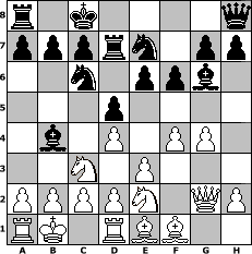 game notation in PGN-format [Event "960-Sommerturnier 2014"] [Site "www.myChess.de"] [Date "2014.07.24"] [Round "1"] [White "hubi"] [Black "Erich"] [Variant "Fischerrandom"] [SetUp "1"] [FEN "rnkrbbnq/pppppppp/8/8/8/8/PPPPPPPP/RNKRBBNQ w KQkq - 0 1"] [WhitemyELO "1915"] [BlackmyELO "2060"] [Result "0-1"] [TimeControl "10/2592000"] [WhiteDays "00"] [BlackDays "30"] [MyChessNo "95239"] 1. d4 d5 2. e3 e6 3. Nc3 Nc6 4. Kb1 f6 5. f4 Bg6 6. g4 Bb4 7. Nge2 Nge7 8. Qg2 Rd7 0-1 position notation in FEN-format r1k4q/ppprn1pp/2n1ppb1/3p4/1b1P1PP1/2N1P3/PPPPN1QP/RK1RBB2 - q - 5 9 Captured white pieces: Captured black pieces: Click on a captured piece in order to display the desired move!
