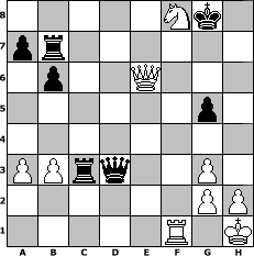 game notation in PGN-format [Event "Zur Fastenzeit"] [Site "www.myChess.de"] [Date "2018.03.15"] [Round "1"] [White "Naunhofer"] [Black "sprinterde"] [ECO "A40"] [WhitemyELO "1641"] [BlackmyELO "1729"] [Result "1/2-1/2"] [TimeControl "10/3456000"] [WhiteDays "40"] [BlackDays "40"] [MyChessNo "111727"] 1. d4 e6 2. c4 Nf6 3. Nc3 Bb4 4. Qc2 O-O 5. Bg5 h6 6. Bh4 g5 7. Bg3 d5 8. e3 Nc6 9. Bd3 dxc4 10. Bxc4 b6 11. Nge2 Na5 12. Bd3 Re8 13. O-O Bb7 14. Ne4 Bxe4 15. Bxe4 Nxe4 16. Qxe4 Bd6 17. Rac1 f5 18. Qd3 Bxg3 19. fxg3 c5 20. b3 Nc6 21. Qc3 Nb4 22. Qd2 Qd5 23. a3 Nc6 24. Qb2 Qe4 25. Kf2 cxd4 26. Nxd4 Ne5 27. Qe2 Nd3+ 28. Kg1 Nxc1 29. Rxc1 Rac8 30. Rf1 Rc3 31. Qh5 Qxe3+ 32. Kh1 Re7 33. Qg6+ Rg7 34. Qe8+ Kh7 35. Nxe6 Rb7 36. Nf8+ Kh8 37. Ne6+ Kh7 38. Nf8+ Kg7 39. Qg6+ Kh8 40. Qxh6+ Kg8 41. Ng6 Qd4 42. Qf8+ Kh7 43. Qxf5 Qd3 44. Nf8+ Kg8 45. Qe6+ Kh8 46. Qh6+ Kg8 47. Qe6+ 1/2-1/2 position notation in FEN-format 5Nk1/pr6/1p2Q3/6p1/8/PPrq2P1/6PP/5R1K - - - 8 47 Captured white pieces: ![]() ![]() ![]() ![]() ![]() ![]() ![]() ![]() ![]() ![]() ![]() ![]() ![]() ![]() ![]() Captured black pieces: ![]() ![]() ![]() ![]() ![]() ![]() ![]() ![]() ![]() ![]() ![]() ![]() ![]() ![]() ![]() Click on a captured piece in order to display the desired move!