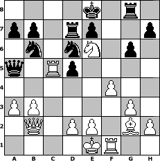 game notation in PGN-format [Event "MLN 960er langsam 2014"] [Site "www.myChess.de"] [Date "2014.01.31"] [Round "1"] [White "SibylleSchwerdt"] [Black "reisinger"] [Variant "Fischerrandom"] [SetUp "1"] [FEN "nqnrkrbb/pppppppp/8/8/8/8/PPPPPPPP/NQNRKRBB w KQkq - 0 1"] [WhitemyELO "1569"] [BlackmyELO "1544"] [Result "1-0"] [TimeControl "10/3456000"] [WhiteDays "40"] [BlackDays "40"] [MyChessNo "92653"] 1. f4 f5 2. Bd4 Bd5 3. b3 g6 4. Bxh8 Rxh8 5. c4 Bc6 6. Nd3 Be4 7. Qb2 Rg8 8. Nf2 Nd6 9. c5 Nf7 10. Nxe4 fxe4 11. g3 d5 12. cxd6 cxd6 13. Bxe4 d5 14. Bg2 Nb6 15. Nc2 Qd6 16. Nd4 Qb4 17. Rc1 Nd6 18. a3 Qa5 19. Ne6 Rd7 20. Rc5 1-0 position notation in FEN-format 4k1r1/pp1rp2p/1n1nN1p1/q1Rp4/5P2/PP4P1/1Q1PP1BP/4KR2 - K - 4 20 Captured white pieces: Captured black pieces: Click on a captured piece in order to display the desired move!