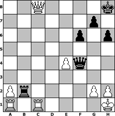 game notation in PGN-format [Event "Wikingermeisterschaft Endrunde"] [Site "www.myChess.de"] [Date "2006.08.05"] [Round "1"] [White "chessmike"] [Black "73DADDELDU37"] [ECO "A42"] [WhitemyELO "1954"] [BlackmyELO "1551"] [Result "1-0"] [TimeControl "10/1728000"] [WhiteDays "80"] [BlackDays "80"] [MyChessNo "27433"] 1. d4 d6 2. c4 Nf6 3. Nc3 e6 4. e4 Be7 5. f4 O-O 6. Nf3 c6 7. Bd3 h6 8. O-O e5 9. dxe5 dxe5 10. Nxe5 Nbd7 11. Nxd7 Nxd7 12. Qf3 Qb6+ 13. Kh1 Nc5 14. Bc2 Be6 15. b3 Qd8 16. Bb2 f6 17. Ne2 Qd2 18. Nd4 Qa5 19. b4 Qxb4 20. Ba3 Qxc4 21. Nxe6 Qxc2 22. Bxc5 Bxc5 23. Rfc1 Qb2 24. Nxc5 Qd4 25. Ne6 Qb4 26. Nxf8 Qxf8 27. Qb3+ Kh8 28. Qxb7 Rb8 29. Qxa7 Rb2 30. Qc5 Qb8 31. Qxc6 Qxf4 32. Qc8+ 1-0 position notation in FEN-format 2Q4k/6p1/5p1p/8/4Pq2/8/Pr4PP/R1R4K - - - 1 32 Captured white pieces: Captured black pieces: Click on a captured piece in order to display the desired move!