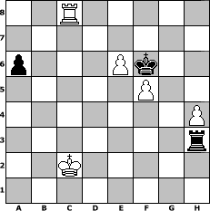 game notation in PGN-format [Event "Arpad Elo Geburtstagstunier"] [Site "www.myChess.de"] [Date "2011.08.23"] [Round "1"] [White "deepsabel"] [Black "bjeu"] [ECO "D15"] [WhitemyELO "2009"] [BlackmyELO "2099"] [Result "1-0"] [TimeControl "10/1728000"] [WhiteDays "16"] [BlackDays "07"] [MyChessNo "75703"] 1. d4 d5 2. c4 c6 3. Nf3 Nf6 4. Nc3 e6 5. Bg5 Bd6 6. e3 Nbd7 7. Bd3 h6 8. Bh4 O-O 9. O-O Bb8 10. Rc1 Re8 11. Re1 a6 12. a3 dxc4 13. Bxc4 b5 14. Bd3 g5 15. Nxg5 hxg5 16. Bxg5 Kg7 17. Ne4 Rh8 18. g3 Qe8 19. Nxf6 Nxf6 20. Qf3 Nd7 21. Be4 f5 22. Bxc6 Ra7 23. e4 Qh5 24. Qxh5 Rxh5 25. Be3 fxe4 26. Bxe4 Rh8 27. d5 Rc7 28. Rxc7 Bxc7 29. dxe6 Nf6 30. Bf5 Be5 31. Bc1 Bd4 32. h4 Ne8 33. Bh3 Nc7 34. Bf4 Nd5 35. Be5+ Bxe5 36. Rxe5 Ne7 37. f4 Rd8 38. Kf2 Rd2+ 39. Re2 Rd3 40. f5 Bb7 41. Bg2 Bxg2 42. Kxg2 b4 43. g4 bxa3 44. bxa3 Rxa3 45. Re5 Ra2+ 46. Kf3 Kf6 47. Rc5 Ra3+ 48. Ke2 Ra2+ 49. Kd3 Ra3+ 50. Kc2 Nxf5 51. gxf5 Rh3 52. Rc8 1-0 position notation in FEN-format 2R5/8/p3Pk2/5P2/7P/7r/2K5/8 - - - 2 52 Captured white pieces: Captured black pieces: Click on a captured piece in order to display the desired move!