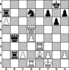 game notation in PGN-format [Event "Gegen zuviel Leerlauf..."] [Site "www.myChess.de"] [Date "2013.06.22"] [Round "1"] [White "Vahl1"] [Black "Lydia"] [ECO "A15"] [WhitemyELO "1671"] [BlackmyELO "1531"] [Result "1-0"] [TimeControl "10/3456000"] [WhiteDays "114"] [BlackDays "110"] [MyChessNo "88972"] 1. c4 Nf6 2. d4 e6 3. Nc3 Bb4 4. e3 b6 5. Nge2 O-O 6. a3 Bxc3+ 7. Nxc3 d5 8. b4 Bb7 9. Qf3 Nbd7 10. Bb2 c5 11. dxc5 bxc5 12. cxd5 exd5 13. Be2 Rb8 14. Qf4 d4 15. exd4 cxb4 16. axb4 a5 17. bxa5 Bxg2 18. Rg1 Rxb2 19. Rxg2 Qe7 20. Qc1 Rfb8 21. a6 R2b6 22. Qg5 g6 23. Kf1 Ra8 24. Rg3 Ra7 25. Rd1 Rb2 26. Re3 Qb4 27. Nd5 Nxd5 28. Qxd5 1-0 position notation in FEN-format 6k1/r2n1p1p/P5p1/3Q4/1q1P4/4R3/1rP1BP1P/3R1K2 - - - 0 28 Captured white pieces: Captured black pieces: Click on a captured piece in order to display the desired move!