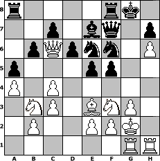 game notation in PGN-format [Event "1000 Jahre Schachdorf Str"] [Site "www.myChess.de"] [Date "2011.08.22"] [Round "1"] [White "Svetlana"] [Black "Erich"] [ECO "C24"] [WhitemyELO "1729"] [BlackmyELO "1926"] [Result "1/2-1/2"] [TimeControl "10/2592000"] [WhiteDays "27"] [BlackDays "30"] [MyChessNo "75663"] 1. e4 e5 2. Bc4 Nf6 3. d3 Nc6 4. Nf3 Be7 5. O-O O-O 6. Re1 d6 7. a4 Be6 8. Nbd2 Nd7 9. c3 a5 10. h3 Bf6 11. Nb3 Bxc4 12. dxc4 Re8 13. Qd5 Ne7 14. Qd1 Ng6 15. Be3 b6 16. g3 Qc8 17. h4 Be7 18. h5 Ngf8 19. h6 g6 20. Qd3 Ne6 21. Rad1 Rf8 22. Kg2 Qd8 23. Ra1 Qe8 24. Rh1 f5 25. exf5 gxf5 26. Qd5 Qf7 27. Rag1 Nf6 28. Qc6 1/2-1/2 position notation in FEN-format r4rk1/2p1bq1p/1pQpnn1P/p3pp2/P1P5/1NP1BNP1/1P2PPK1/6RR - - - 5 28 Captured white pieces: Captured black pieces: Click on a captured piece in order to display the desired move!