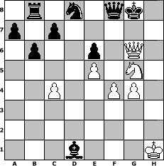 game notation in PGN-format [Event "> 1500"] [Site "www.myChess.de"] [Date "2010.03.18"] [Round "1"] [White "beowulf"] [Black "Winston"] [ECO "D06"] [WhitemyELO "1336"] [BlackmyELO "1389"] [Result "1/2-1/2"] [TimeControl "10/2592000"] [WhiteDays "120"] [BlackDays "119"] [MyChessNo "64100"] 1. d4 d5 2. c4 b6 3. Nc3 e6 4. Nf3 Nf6 5. Bg5 Be7 6. e4 dxe4 7. Bxf6 Bxf6 8. Nxe4 Be7 9. Be2 Bb7 10. Nc3 O-O 11. O-O Bf6 12. Ne5 Bxe5 13. dxe5 Nd7 14. f4 Qe7 15. Qc2 Nc5 16. Rad1 Bc6 17. Rd2 Qe8 18. Rfd1 Qe7 19. b4 Nb7 20. a3 Rfc8 21. b5 Be8 22. Bf3 Rab8 23. Ne4 Rd8 24. Ng5 g6 25. Rxd8 Nxd8 26. h4 Qc5+ 27. Kh1 Bxb5 28. Be4 Be8 29. h5 Qxa3 30. hxg6 fxg6 31. g4 Ba4 32. Qh2 Qe7 33. Qh6 Bxd1 34. Bxg6 hxg6 35. Qxg6+ Qg7 36. Qe8+ Qf8 37. Qg6+ Qg7 38. Qe8+ Qf8 39. Qg6+ 1/2-1/2 position notation in FEN-format 1r1n1qk1/p1p5/1p2p1Q1/4P1N1/2P2PP1/8/8/3b3K - - - 8 39 Captured white pieces: Captured black pieces: Click on a captured piece in order to display the desired move!