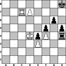 game notation in PGN-format [Event "Gegen die Sommerflaute"] [Site "www.myChess.de"] [Date "2013.07.17"] [Round "1"] [White "Seneca"] [Black "Haki"] [ECO "A45"] [WhitemyELO "1554"] [BlackmyELO "1326"] [Result "1-0"] [TimeControl "10/864000"] [WhiteDays "54"] [BlackDays "60"] [MyChessNo "89343"] 1. d4 Nf6 2. e3 d5 3. Bd3 e6 4. Nd2 Bd6 5. f4 O-O 6. Qf3 c5 7. c3 c4 8. Bc2 Nc6 9. Ne2 b5 10. O-O g6 11. b4 a5 12. bxa5 Bb7 13. Bb2 Rxa5 14. a4 b4 15. cxb4 Nxb4 16. Bd1 Bc6 17. Bc3 Ra6 18. Nc1 Qc7 19. Na2 Nxa2 20. Rxa2 Ne4 21. Nxe4 dxe4 22. Qe2 Rfa8 23. Qxc4 Bd5 24. Qxc7 Bxc7 25. Ra1 Ba5 26. Bxa5 Rxa5 27. Rf2 f5 28. Rb2 h6 29. Rb4 Bc6 30. Kf2 h5 31. Bb3 Bd5 32. Bxd5 exd5 33. h4 Rc8 34. Ra3 Rc4 35. Rb5 Rc2+ 36. Kg3 Ra8 37. Rxd5 Re2 38. Rc5 Rb8 39. Rac3 Kg7 40. Rb5 Rxb5 41. axb5 Rb2 42. Kh3 Rxb5 43. g3 Rb1 44. Kg2 Rb2+ 45. Kf1 Rb1+ 46. Ke2 Rb2+ 47. Kd1 Rg2 48. d5 Rxg3 49. Rc7+ Kh8 50. Ke2 Rg2+ 51. Ke1 Rg1+ 52. Kd2 Rg2+ 53. Kc3 Rh2 54. d6 Rh3 55. Kd4 Rxh4 56. d7 1-0 position notation in FEN-format 7k/2RP4/6p1/5p1p/3KpP1r/4P3/8/8 - - - 0 56 Captured white pieces: Captured black pieces: Click on a captured piece in order to display the desired move!