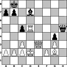 game notation in PGN-format [Event "DEKRON-960"] [Site "www.myChess.de"] [Date "2008.02.03"] [Round "1"] [White "Seneca"] [Black "reisinger"] [Variant "Fischerrandom"] [SetUp "1"] [FEN "rbnkbrnq/pppppppp/8/8/8/8/PPPPPPPP/RBNKBRNQ w KQkq - 0 1"] [WhitemyELO "1606"] [BlackmyELO "1431"] [Result "1-0"] [TimeControl "10/1728000"] [WhiteDays "18"] [BlackDays "20"] [MyChessNo "42275"] 1. c3 f5 2. g3 c6 3. Nf3 Nh6 4. d4 Nb6 5. Nb3 Bd6 6. Bd2 g6 7. Bxh6 Rf7 8. Bd3 O-O-O 9. Bd2 Bc7 10. O-O-O d6 11. e4 fxe4 12. Bxe4 d5 13. Bd3 Qf8 14. Be2 Rd6 15. Be3 Nd7 16. Ng5 Rg7 17. Bg4 h5 18. Ne6 Qf6 19. Nxg7 Qxg7 20. Bh3 g5 21. Nc5 g4 22. Nxd7 Bxd7 23. Bg2 Rg6 24. h3 Kb8 25. hxg4 hxg4 26. Rd2 e5 27. dxe5 Bxe5 28. Bd4 Bxd4 29. Rxd4 Re6 30. Re1 Rxe1+ 31. Qxe1 Qg5+ 32. Qe3 Qh5 33. Kd2 c5 34. Rxd5 1-0 position notation in FEN-format 1k6/pp1b4/8/2pR3q/6p1/2P1Q1P1/PPPK1PB1/8 - - - 0 34 Captured white pieces: Captured black pieces: Click on a captured piece in order to display the desired move!