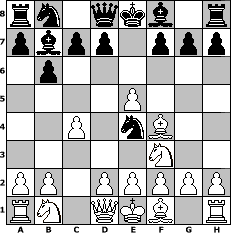 game notation in PGN-format [Event "F"] [Site "www.myChess.de"] [Date "2006.05.06"] [Round "2"] [White "schlachtross"] [Black "nogumo"] [ECO "A51"] [WhitemyELO "1906"] [BlackmyELO "1816"] [Result "0-1"] [TimeControl "10/1728000"] [WhiteDays "00"] [BlackDays "20"] [MyChessNo "25219"] 1. d4 Nf6 2. c4 e5 3. dxe5 Ne4 4. Nf3 b6 5. Bf4 Bb7 0-1 position notation in FEN-format rn1qkb1r/pbpp1ppp/1p6/4P3/2P1nB2/5N2/PP1PPPPP/RN1QKB1R - KQkq - 2 6 Captured white pieces: Captured black pieces: Click on a captured piece in order to display the desired move!