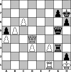 game notation in PGN-format [Event "fr"] [Site "www.myChess.de"] [Date "2011.10.14"] [Round "1"] [White "Erich"] [Black "Schachfedi"] [ECO "B00"] [WhitemyELO "1963"] [BlackmyELO "1817"] [Result "1/2-1/2"] [TimeControl "10/1728000"] [WhiteDays "20"] [BlackDays "02"] [MyChessNo "76807"] 1. e4 Nc6 2. Nf3 e5 3. Bc4 Bc5 4. c3 Nf6 5. d3 O-O 6. O-O d5 7. exd5 Nxd5 8. Re1 Be6 9. Nbd2 Bd6 10. Ne4 h6 11. a4 Re8 12. b4 a6 13. Bd2 Nf6 14. Bxe6 Rxe6 15. Qe2 Nd7 16. Rad1 Qe7 17. Rb1 f5 18. Nxd6 Qxd6 19. Nh4 Rf8 20. b5 Ne7 21. c4 Nc5 22. Bb4 a5 23. Ba3 b6 24. Rbd1 Rff6 25. Nf3 Ng6 26. Qe3 Qf8 27. Nd2 Nf4 28. Bxc5 bxc5 29. Kh1 Rg6 30. Rg1 Qa8 31. f3 Rg5 32. Nb3 Reg6 33. Rd2 Nh3 34. Rf1 Nf4 35. g3 Nh5 36. Rg2 Nf4 37. Qxe5 Nxg2 38. Kxg2 Kh7 39. Nxc5 f4 40. Qxc7 fxg3 41. Ne4 gxh2+ 42. Nxg5+ Rxg5+ 43. Kh1 Qe8 44. Qc6 Qh5 45. Qe4+ Rg6 46. Qd4 Rg3 47. c5 Qg5 48. c6 1/2-1/2 position notation in FEN-format 8/6pk/2P4p/pP4q1/P2Q4/3P1Pr1/7p/5R1K - - - 0 48 Captured white pieces: Captured black pieces: Click on a captured piece in order to display the desired move!
