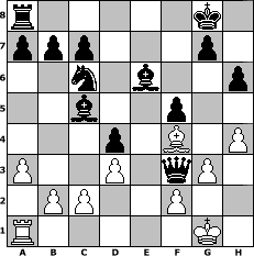 game notation in PGN-format [Event "Gl"] [Site "www.myChess.de"] [Date "2013.12.27"] [Round "1"] [White "alpacino"] [Black "pepo47"] [ECO "B02"] [WhitemyELO "1379"] [BlackmyELO "2076"] [Result "0-1"] [TimeControl "10/2592000"] [WhiteDays "76"] [BlackDays "89"] [MyChessNo "91828"] 1. e4 Nf6 2. d3 e5 3. Nf3 Nc6 4. Bd2 Bc5 5. Qe2 O-O 6. h3 d5 7. Nc3 d4 8. Nd5 Nxd5 9. exd5 Qxd5 10. a3 f5 11. h4 Rf6 12. Ng5 h6 13. Nf3 Re6 14. g3 e4 15. Bg2 exf3 16. Qxe6+ Qxe6+ 17. Kf1 Qe2+ 18. Kg1 fxg2 19. Bf4 gxh1=Q+ 20. Kxh1 Qf3+ 21. Kg1 Be6 0-1 position notation in FEN-format r5k1/ppp3p1/2n1b2p/2b2p2/3p1B1P/P2P1qP1/1PP2P2/R5K1 - - - 3 22 Captured white pieces: Captured black pieces: Click on a captured piece in order to display the desired move!