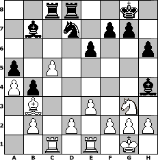 game notation in PGN-format [Event "Regenturnier"] [Site "www.myChess.de"] [Date "2009.08.01"] [Round "1"] [White "Steppenwolf"] [Black "Robur"] [ECO "?"] [WhitemyELO "1148"] [BlackmyELO "1788"] [Result "0-1"] [TimeControl "10/2592000"] [WhiteDays "68"] [BlackDays "40"] [MyChessNo "57939"] 1. d4 Nf6 2. c4 e6 3. Nc3 d5 4. Bg5 Be7 5. e3 O-O 6. Nf3 c6 7. Bd3 Nbd7 8. O-O Re8 9. Nh4 h6 10. Bxf6 Nxf6 11. Re1 dxc4 12. Bxc4 b5 13. Bb3 a5 14. a4 b4 15. Ne2 Bb7 16. Ng3 c5 17. dxc5 Rc8 18. Qxd8 Rexd8 19. Rad1 Nd7 20. Rc1 Bxh4 0-1 position notation in FEN-format 2rr2k1/1b1n1pp1/4p2p/p1P5/Pp5b/1B2P1N1/1P1P1PPP/2R1R1K1 - - - 0 21 Captured white pieces: Captured black pieces: Click on a captured piece in order to display the desired move!