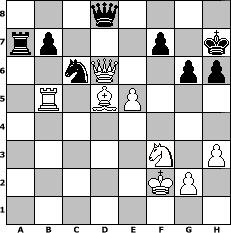 game notation in PGN-format [Event "Svetlana Open 2012"] [Site "www.myChess.de"] [Date "2012.03.22"] [Round "1"] [White "Erich"] [Black "ClaudiaN"] [ECO "A06"] [WhitemyELO "2035"] [BlackmyELO "1871"] [Result "1-0"] [TimeControl "10/2592000"] [WhiteDays "30"] [BlackDays "30"] [MyChessNo "80740"] 1. Nf3 d5 2. b3 Nf6 3. Bb2 g6 4. e3 Bg7 5. c4 O-O 6. cxd5 Nxd5 7. Bxg7 Kxg7 8. Be2 Nc6 9. d4 Qd6 10. O-O Bf5 11. Qc1 Rad8 12. Nbd2 a6 13. Re1 Nf6 14. Qb2 Kg8 15. Rac1 Qd7 16. b4 Be6 17. a4 Qd6 18. b5 axb5 19. axb5 Na5 20. e4 Qb6 21. Qc3 Bg4 22. Bf1 Bxf3 23. Nxf3 Rfe8 24. Ra1 Ra8 25. Ra4 Ra7 26. Qa3 Qd6 27. Qa2 Qb6 28. e5 Ng4 29. Ng5 Rf8 30. Qa3 h6 31. Nf3 c6 32. Rb1 e6 33. h3 Nxf2 34. Kxf2 Rfa8 35. Qe7 cxb5 36. Rxb5 Nc6 37. Qd6 Qd8 38. Rxa7 Rxa7 39. Bc4 Kh7 40. d5 exd5 41. Bxd5 1-0 position notation in FEN-format 3q4/rp3p1k/2nQ2pp/1R1BP3/8/5N1P/5KP1/8 - - - 0 41 Captured white pieces: ![]() ![]() ![]() ![]() ![]() ![]() ![]() ![]() ![]() ![]() ![]() ![]() ![]() ![]() ![]() Captured black pieces: ![]() ![]() ![]() ![]() ![]() ![]() ![]() ![]() ![]() ![]() ![]() ![]() ![]() ![]() ![]() Click on a captured piece in order to display the desired move!