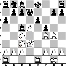game notation in PGN-format [Event "MySchachOpen"] [Site "www.myChess.de"] [Date "2005.01.22"] [Round "1"] [White "Robur"] [Black "Bernd"] [ECO "B01"] [WhitemyELO "1655"] [BlackmyELO "1382"] [Result "1-0"] [TimeControl "10/2592000"] [WhiteDays "49"] [BlackDays "00"] [MyChessNo "9877"] 1. e4 d5 2. exd5 Qxd5 3. Nc3 Qe5+ 4. Be2 e6 5. Nf3 Qd6 6. O-O f5 7. d4 Nf6 8. Ne5 a6 9. Bf4 Qb6 10. Nc4 Qc6 11. Qd3 Ng4 12. d5 Qd7 13. Rfe1 Bc5 14. Bxg4 1-0 position notation in FEN-format rnb1k2r/1ppq2pp/p3p3/2bP1p2/2N2BB1/2NQ4/PPP2PPP/R3R1K1 - kq - 0 14 Captured white pieces: Captured black pieces: Click on a captured piece in order to display the desired move!