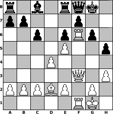 game notation in PGN-format [Event "Sp"] [Site "www.myChess.de"] [Date "2011.09.07"] [Round "1"] [White "BobbyF4"] [Black "Seneca"] [ECO "B07"] [WhitemyELO "1495"] [BlackmyELO "1516"] [Result "1-0"] [TimeControl "10/1728000"] [WhiteDays "04"] [BlackDays "08"] [MyChessNo "76186"] 1. e4 d6 2. d4 Nf6 3. Bc4 e6 4. Nc3 g6 5. f4 Bg7 6. e5 dxe5 7. fxe5 Nfd7 8. Nf3 Nb6 9. Bg5 Qd7 10. Bb3 O-O 11. Ne4 Nd5 12. Bxd5 Qxd5 13. Nf6+ Bxf6 14. Bxf6 Qe4+ 15. Kf2 Nd7 16. Re1 Qf5 17. Be7 Re8 18. Bb4 Nb6 19. h3 Nd5 20. Bd2 h5 21. Kg1 Nf4 22. Nh4 Qg5 23. Re4 Qxh4 24. Rxf4 Qe7 25. Rf6 Qf8 26. Qf3 c6 27. Rf1 1-0 position notation in FEN-format r1b1rqk1/pp3p2/2p1pRp1/4P2p/3P4/5Q1P/PPPBP1P1/5RK1 - - - 1 27 Captured white pieces: Captured black pieces: Click on a captured piece in order to display the desired move!