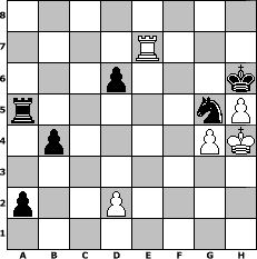 game notation in PGN-format [Event "Schach zur Fußball WM"] [Site "www.myChess.de"] [Date "2018.06.17"] [Round "1"] [White "augustus"] [Black "Joschi"] [ECO "A56"] [WhitemyELO "1060"] [BlackmyELO "1566"] [Result "0-1"] [TimeControl "10/2592000"] [WhiteDays "161"] [BlackDays "178"] [MyChessNo "112436"] 1. d4 Nf6 2. c4 c5 3. e3 cxd4 4. Bd3 dxe3 5. Bxe3 Nc6 6. Nf3 d6 7. O-O g6 8. Ng5 Bg7 9. Qb3 O-O 10. Nc3 Ne5 11. Be4 Nxe4 12. Ncxe4 Bf5 13. Rad1 Qc7 14. Bd4 Qxc4 15. f4 Qxb3 16. axb3 Nc6 17. Bxg7 Kxg7 18. Ng3 Bg4 19. Rd3 a6 20. f5 gxf5 21. Nxf5+ Bxf5 22. Rxf5 h6 23. Rg3 Kh8 24. Rh3 f6 25. Rxh6+ Kg7 26. Rh3 fxg5 27. Rxg5+ Kf7 28. Rh7+ Ke8 29. Rhg7 Kd7 30. h4 Rf6 31. Rh7 Raf8 32. Kh2 Rf2 33. Rgg7 Rxb2 34. Rg3 Nd4 35. Re3 Nf5 36. Rf3 Ke8 37. Rh5 Nd4 38. Rxf8+ Kxf8 39. Rg5 Rxb3 40. Rg4 Ne6 41. h5 Rb5 42. Rh4 Kg7 43. g4 Kh6 44. Kh3 a5 45. Kg3 a4 46. Rh1 Ra5 47. Rc1 a3 48. Ra1 b5 49. Kh4 b4 50. Re1 Ng5 51. Rxe7 a2 0-1 position notation in FEN-format 8/4R3/3p3k/r5nP/1p4PK/8/p2P4/8 - - - 0 52 Captured white pieces: Captured black pieces: Click on a captured piece in order to display the desired move!